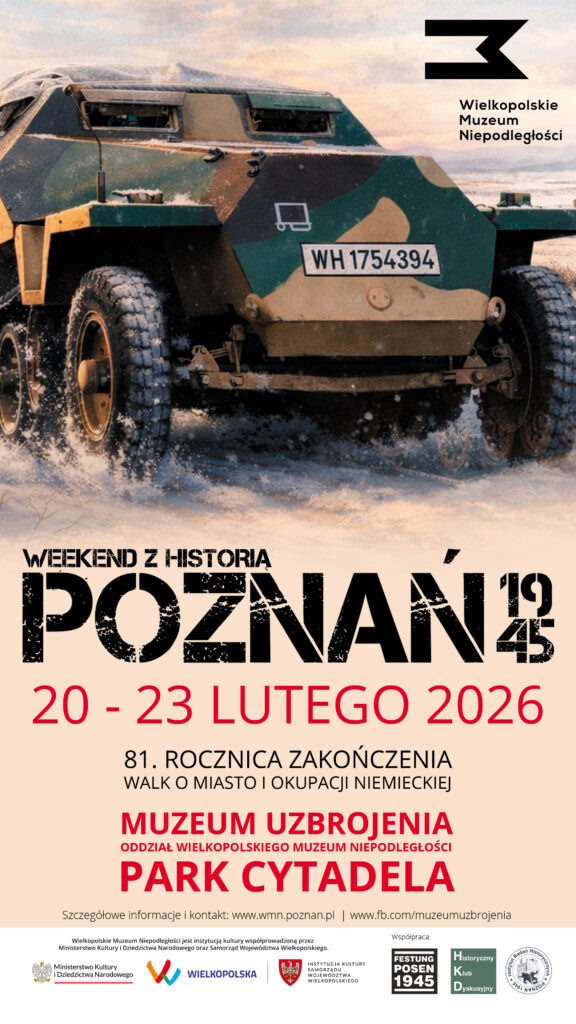 Tematem przewodnim tegorocznego programu są lata 20. i 30. XX wieku oraz rok 1945 w Poznaniu. W Muzeum Powstania Wielkopolskiego 1918-1919 prezentujemy wystawę czasową „Cyryl Ratajski z miastem w tle” w ramach, której polecamy wycieczki, prelekcje, warsztaty, spacer oraz grę! W Muzeum Uzbrojenia czeka na was wystawa czasowa „Depozyt z wieczyńskiego prezbiterium” oraz wydarzenie Poznań 1945 – weekend z historią”, w trakcie którego zaplanowaliśmy sesję popularno-naukową, spacer, pokazy dynamiczne pojazdów pancernych oraz wyjątkowe zwiedzanie ekspozycji stałej w 81. rocznicę zakończenia walk oraz okupacji niemieckiej w Poznaniu – 23 lutego 2026 roku.